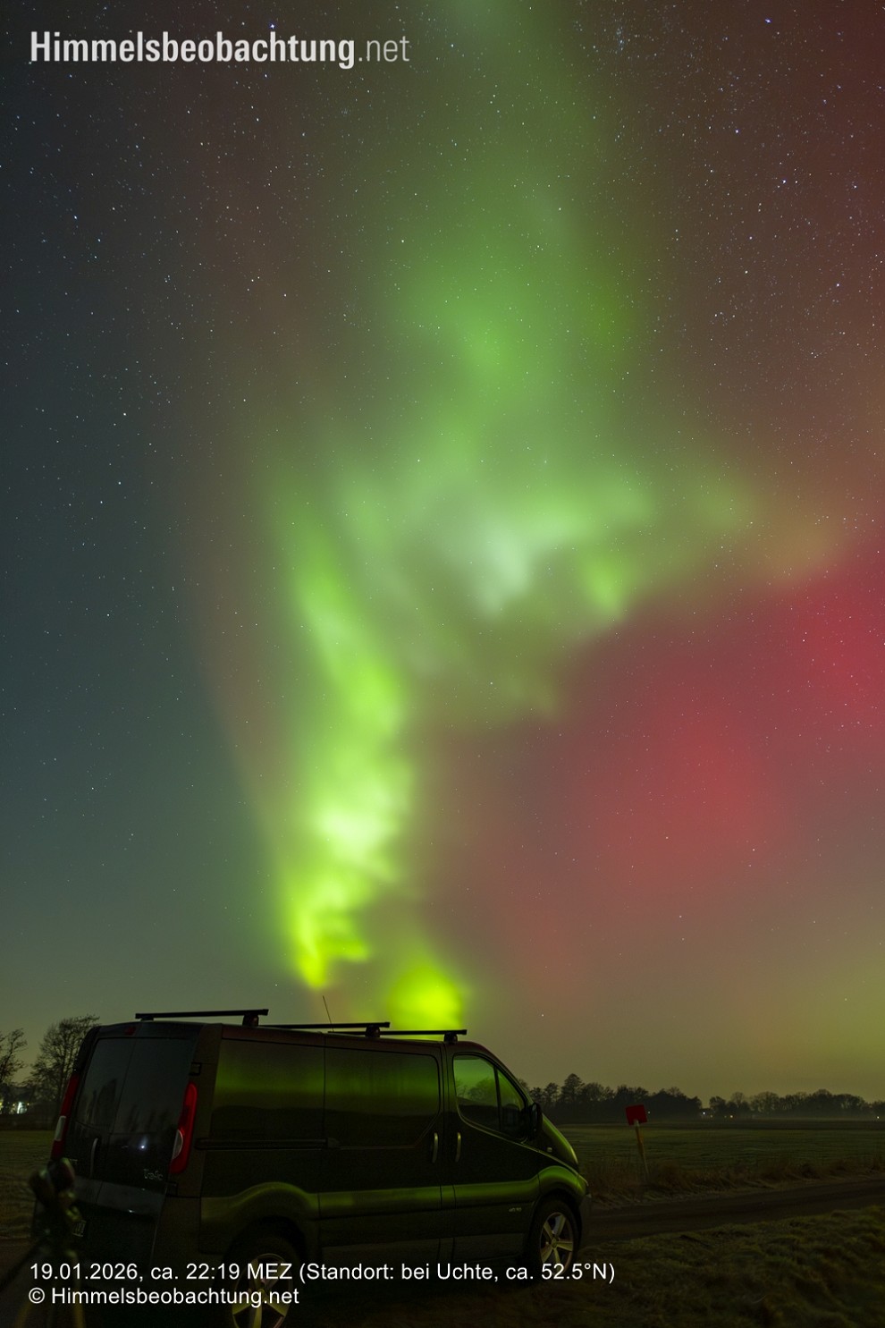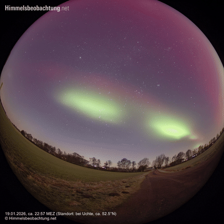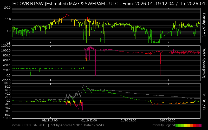 Der 19. Januar 2026 war ein arbeitsreicher Montag, in dessen Verlauf ich einem möglichen Polarlicht wenig Aufmerksamkeit schenken konnte. Zumindest die Kamera-Akkus hatte ich am Morgen noch mit Strom versorgt, um am Abend einen gewissen Zeitvorteil zu haben. Leider fühlte ich mich mit Ende des Arbeitstages immer schlechter und reichlich angeschlagen, weshalb so gar keine Vorfreude auf eine mögliche Beobachtung aufkommen wollte. Die Graphen am EPAM-Plot schnellten derweil immer steiler in die Höhe. Was erst einmal folgte und aufbaute: Ein kleines Abendessen, eine Paracetamol und ein stark sinkender Bz-Wert, gefolgt von einem Impact um etwa 20:20 MEZ – nun musste es losgehen und siehe da, die Abgeschlagenheit wich purem Adrenalin.