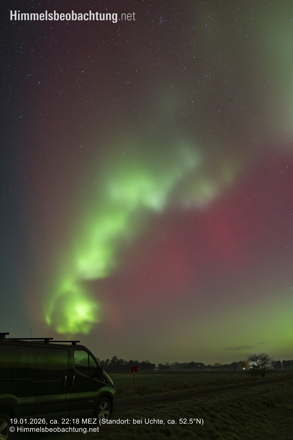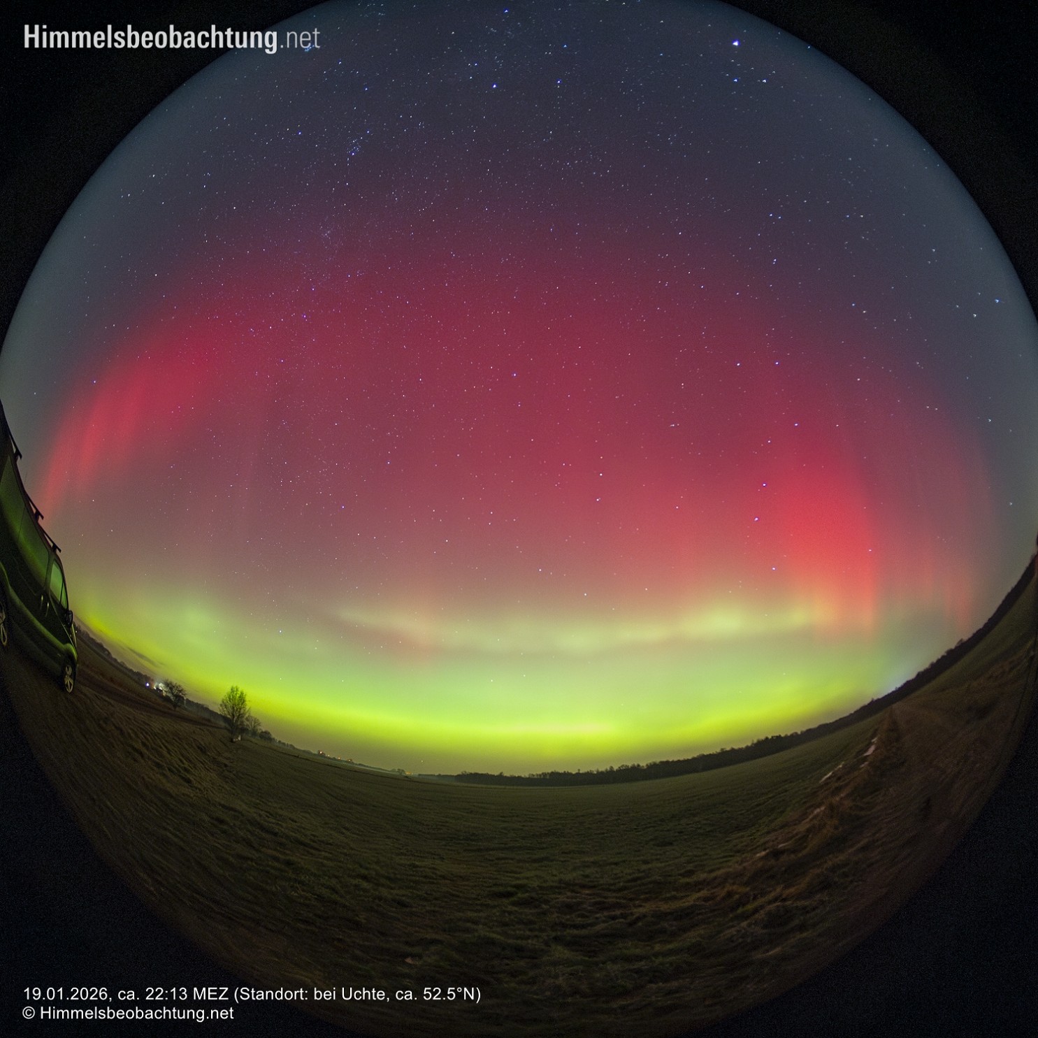 Die Beobachtung dieser großen Polarlichtnacht konnte ich unter ziemlich guten Bedingungen erleben: Ein wolkenfreier Nachthimmel, frostige Luft – kaum eingetrübt, Neumond und ein CME-Impact passend zur Nachtzeit: Besser konnte man es sich (erst einmal) nicht ausdenken. Dieses Zusammenspiel aus Faktoren im Januar 2026, war ein Glücksfall für große Teile Mitteleuropas!