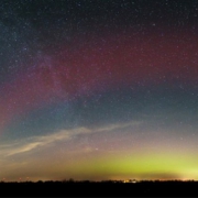 Einsetzendes Polarlicht mit der Abenddämmerung, im Verlauf mit auffäligem Zerfall des grünen Bogens (Verwechslung mit RAGDA) und bemerkenswertem SAR-Bogen.